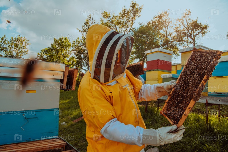 Пчеловод проверяет мед на рамке улья в поле. Владелец малого бизнеса на пасеке. Производитель натуральных здоровых продуктов питания работает с пчелами и ульями на пасеке