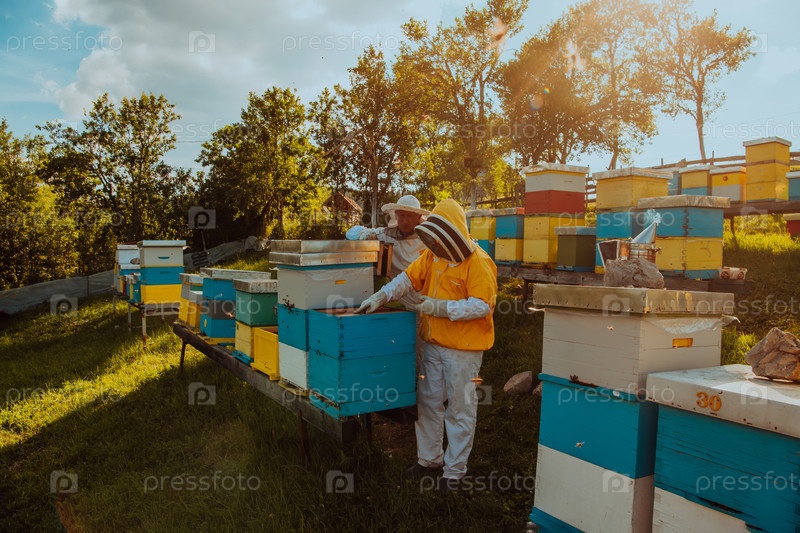 Пчеловоды проверяют мед на рамке улья в поле. Владельцы малого бизнеса на пасеке. Производитель натуральных здоровых продуктов питания работает с пчелами и ульями на пасеке