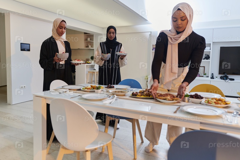 Группа молодых арабских женщин собирается вместе, чтобы с любовью подготовить стол ифтар во время священного мусульманского месяца Рамадан, воплощая в своих кулинарных приготовлениях суть общинного единства, культурных традиций и радостного ожидания