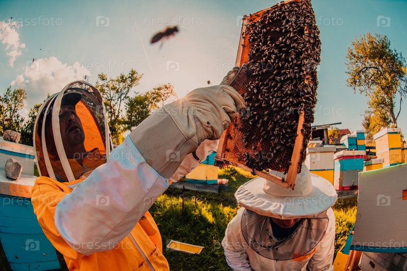 Пчеловоды проверяют мед на рамке улья в поле. Владельцы малого бизнеса на пасеке. Производитель натуральных здоровых продуктов питания работает с пчелами и ульями на пасеке