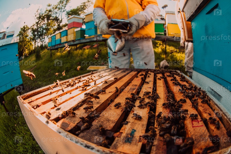 Пчеловоды проверяют мед на рамке улья в поле. Владельцы малого бизнеса на пасеке. Производитель натуральных здоровых продуктов питания работает с пчелами и ульями на пасеке