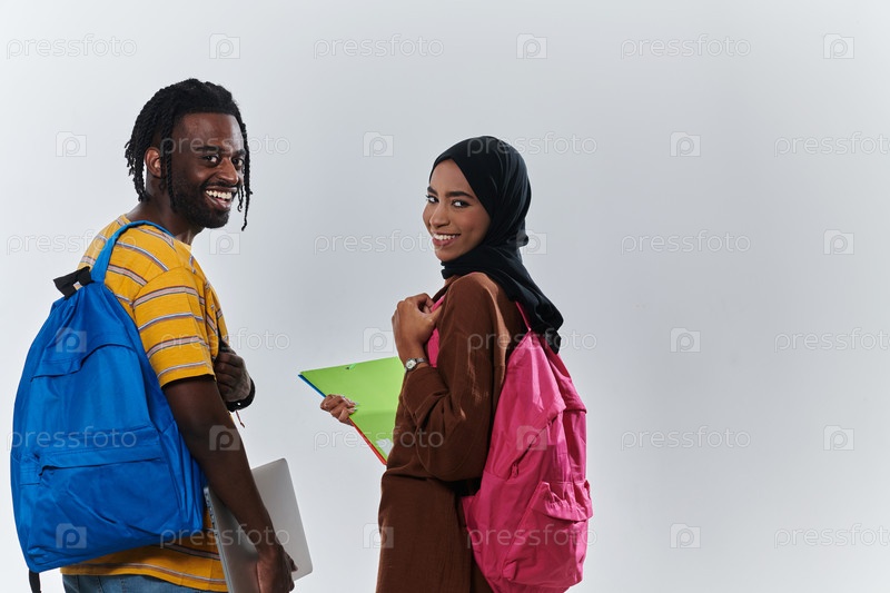 Афроамериканский студент сотрудничает со своей коллегой-мусульманкой, которая усердно работает на своем ноутбуке, символизируя сочетание разнообразия, современного обучения и духа сотрудничества на безмятежном белом фоне
