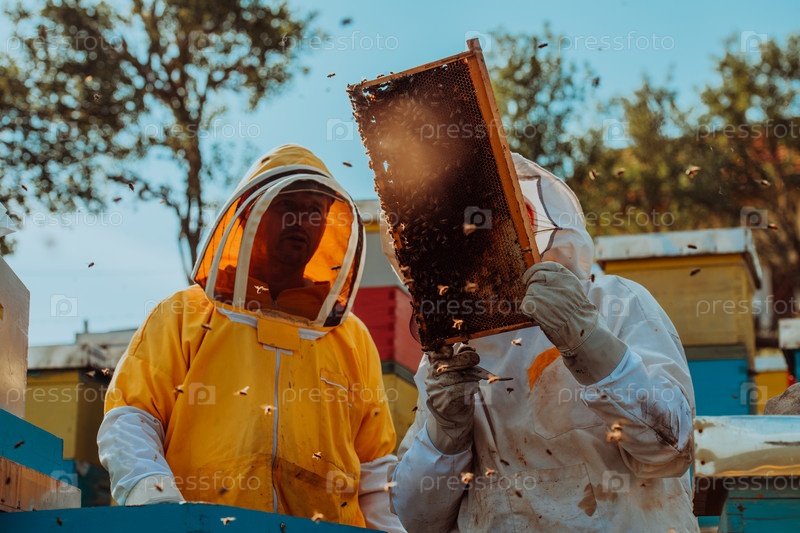 Пчеловоды проверяют мед на рамке улья в поле. Владельцы малого бизнеса на пасеке. Производитель натуральных здоровых продуктов питания работает с пчелами и ульями на пасеке