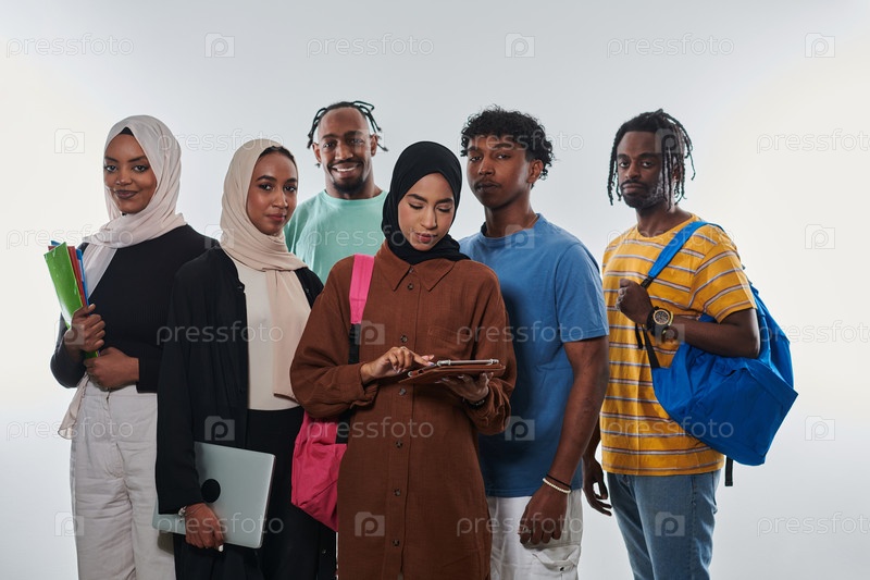 Группа разнообразных студентов занимается современными образовательными практиками, используя различные технологические инструменты, такие как ноутбуки, планшеты и смартфоны, на чистом белом фоне, иллюстрируя современный подход к совместному обучению и до