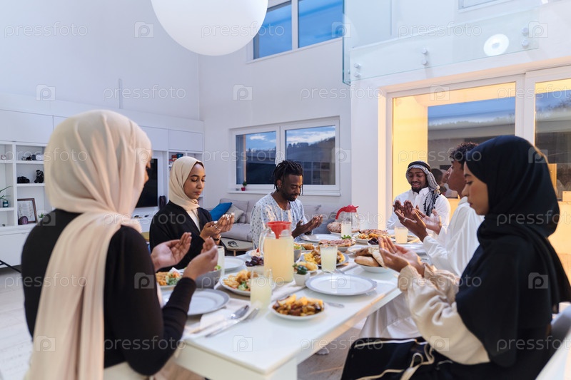 В священный месяц Рамадан разнообразная мусульманская семья объединяется в духовном единстве, горячо молясь Богу перед разговением, фиксируя момент коллективной преданности, культурного разнообразия и семейной радости посреди священного праздника