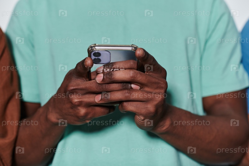 Афроамериканский подросток пользуется своим смартфоном на первозданном белом фоне, воплощая суть современных цифровых технологий и молодежной культуры