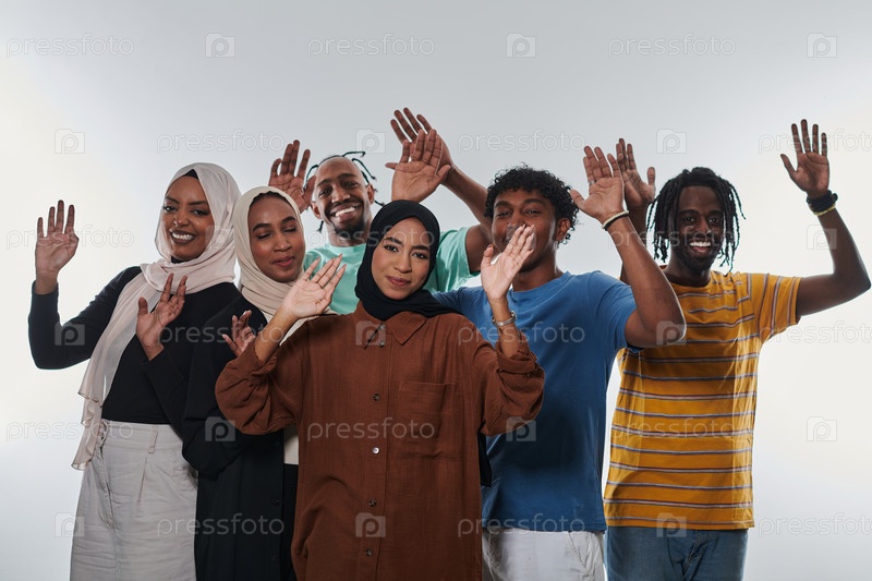 Ликующая и разнообразная группа, в том числе афроамериканец и девушки в хиджабе, энергично машут руками и празднуют, олицетворяя яркость студенческой жизни на белом фоне, символизируя единство, культурное разнообразие и радостный дух общего опыта