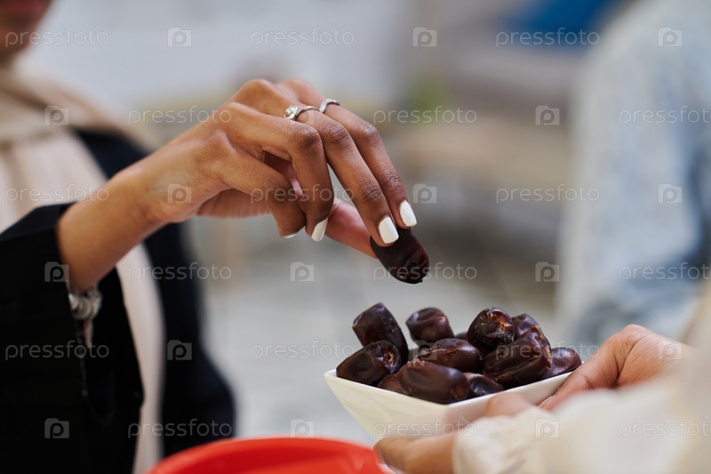 Молодая мусульманка, одетая в хиджаб, деликатно берет свидания, символизируя прекращение ее поста в священный месяц Рамадан, воплощая в себе сцену духовных размышлений, культурных традиций и ожидания совместного ифтара