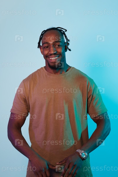 Уверенный и стильный афроамериканец позирует на очаровательном фоне синего геля, демонстрируя свою харизматичность и современное чувство моды в динамичном и ярком портрете