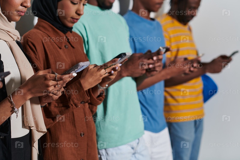 Разнообразная группа студентов, погруженных в эпоху цифровых технологий, объединяется, пользуясь своими смартфонами на белом фоне, символизируя современную эпоху связи, общения и совместного обучения