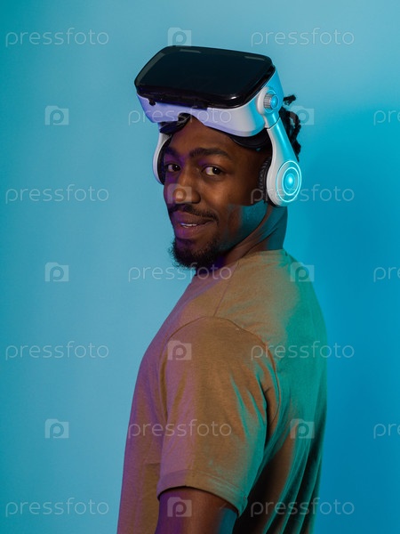 В футуристическом изображении афроамериканец стоит изолированно на ярком синем фоне, украшенный очками виртуальной реальности, которые переносят его в передовую виртуальную реальность, объединяя технологии и инновации на современном дисплее