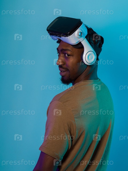 В футуристическом изображении афроамериканец стоит изолированно на ярком синем фоне, украшенный очками виртуальной реальности, которые переносят его в передовую виртуальную реальность, объединяя технологии и инновации на современном дисплее
