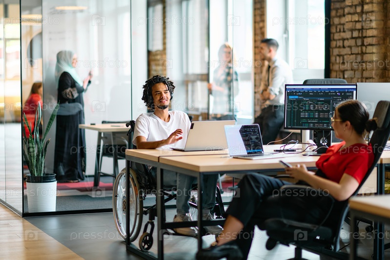 Молодая бизнес-группа, в том числе афроамериканский бизнесмен в инвалидной коляске, сотрудничает в современном стеклянном офисе, активно работает за компьютером и ноутбуком, коллективно и решительно решая разнообразные бизнес-задачи
