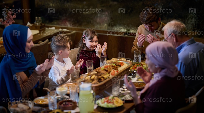 В современном ресторане европейская исламская семья собирается вместе на ифтар во время Рамадана, молясь перед едой, объединяя традиции и современные практики в праздник веры и семьи