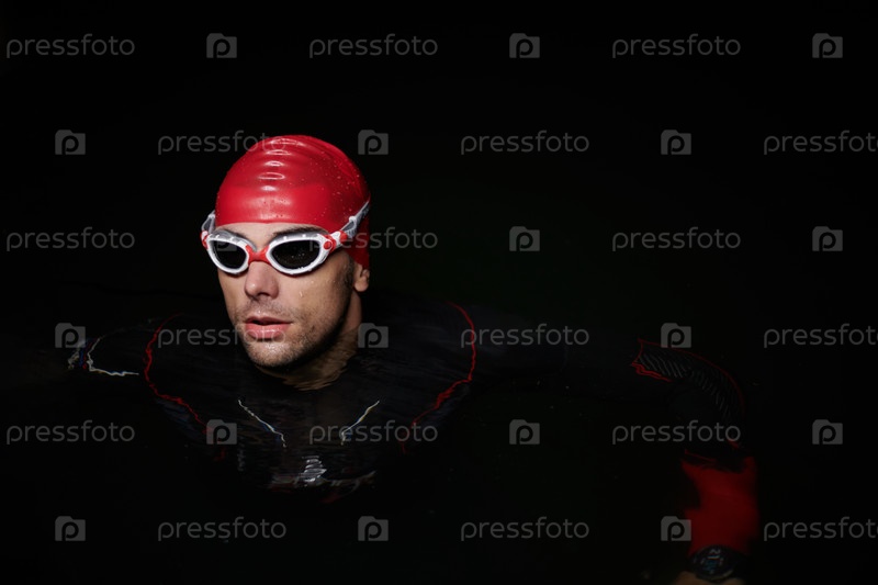 Решительный профессиональный триатлонист проходит тщательную ночную тренировку в холодной воде, демонстрируя преданность делу и стойкость в подготовке к предстоящим соревнованиям по триатлону по плаванию
