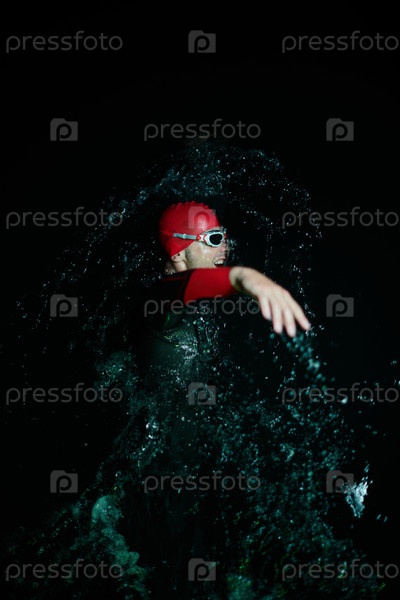 Настоящий пловец-триатлет, отдыхающий во время тяжелых тренировок при ночном неоновом гелевом свете
