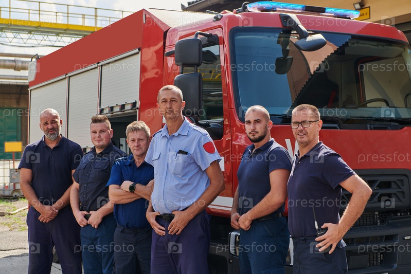 Квалифицированная и преданная своему делу профессиональная команда пожарных с гордостью позирует перед своей современной пожарной машиной, демонстрируя свое современное оборудование и приверженность обеспечению общественной безопасности