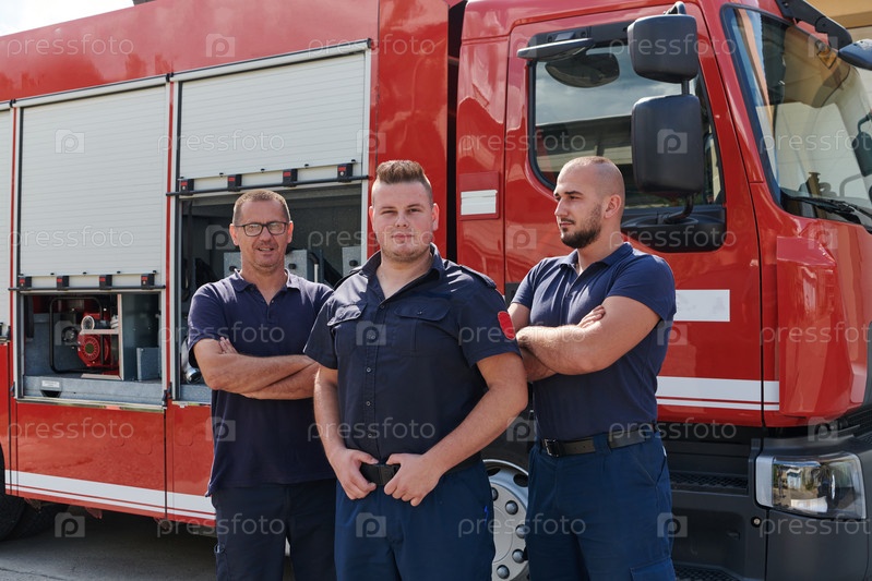 Квалифицированная и преданная своему делу профессиональная команда пожарных с гордостью позирует перед своей современной пожарной машиной, демонстрируя свое современное оборудование и приверженность обеспечению общественной безопасности