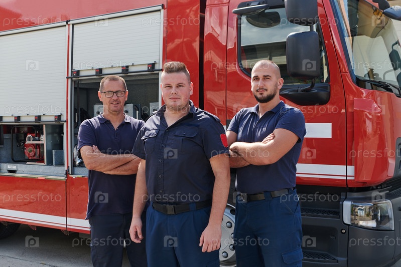 Квалифицированная и преданная своему делу профессиональная команда пожарных с гордостью позирует перед своей современной пожарной машиной, демонстрируя свое современное оборудование и приверженность обеспечению общественной безопасности
