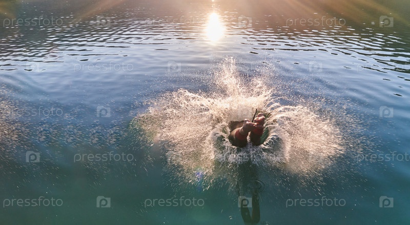 Спортсмен по триатлону плавает на озере на рассвете в гидрокостюме