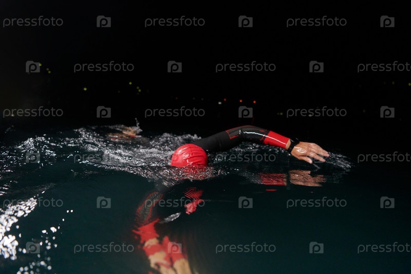 Решительный профессиональный триатлонист проходит тщательную ночную тренировку в холодной воде, демонстрируя преданность делу и стойкость в подготовке к предстоящим соревнованиям по триатлону по плаванию
