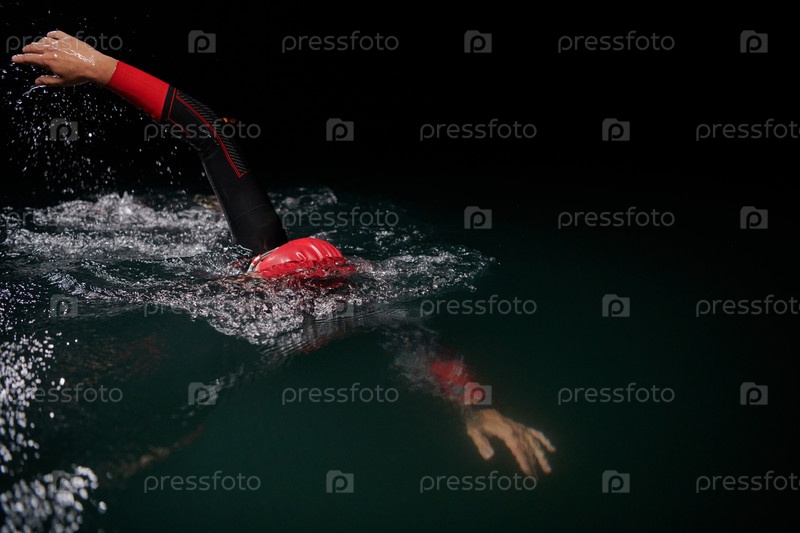 Решительный профессиональный триатлонист проходит тщательную ночную тренировку в холодной воде, демонстрируя преданность делу и стойкость в подготовке к предстоящим соревнованиям по триатлону по плаванию