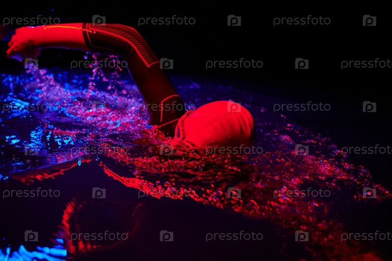 Настоящий пловец-триатлет, отдыхающий во время тяжелых тренировок при ночном неоновом гелевом свете