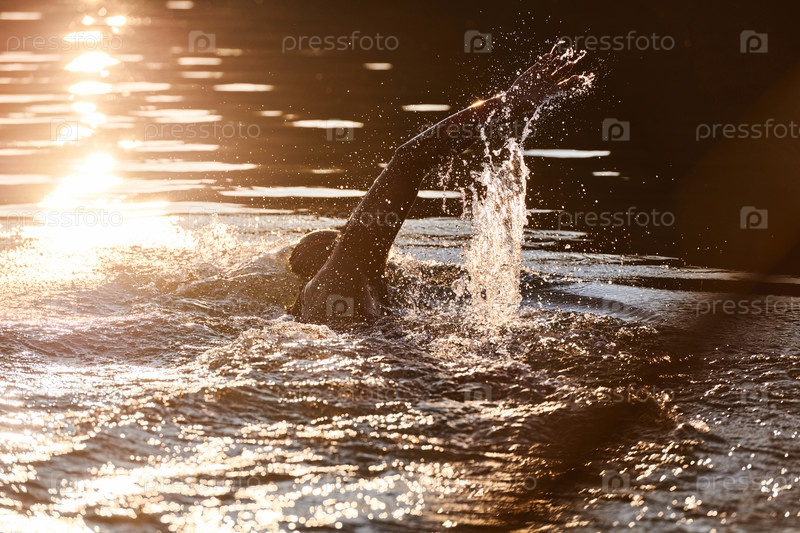 Спортсмен по триатлону плавает на озере на рассвете в гидрокостюме
