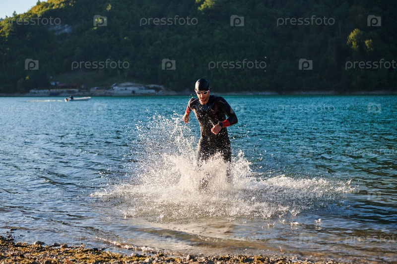 Спортсмен по триатлону начинает тренировку по плаванию на озере