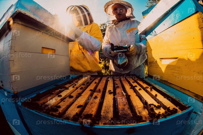 Пчеловоды проверяют мед на рамке улья в поле. Владельцы малого бизнеса на пасеке. Производитель натуральных здоровых продуктов питания работает с пчелами и ульями на пасеке