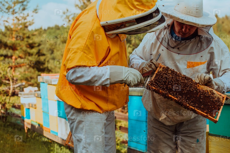 Пчеловоды проверяют мед на рамке улья в поле. Владельцы малого бизнеса на пасеке. Производитель натуральных здоровых продуктов питания работает с пчелами и ульями на пасеке