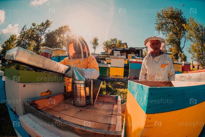 Пчеловоды проверяют мед на рамке улья в поле. Владельцы малого бизнеса на пасеке. Производитель натуральных здоровых продуктов питания работает с пчелами и ульями на пасеке
