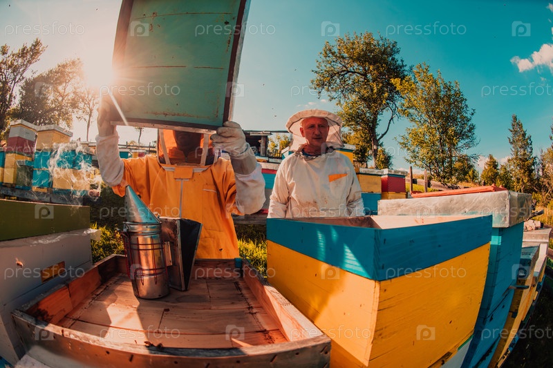 Пчеловоды проверяют мед на рамке улья в поле. Владельцы малого бизнеса на пасеке. Производитель натуральных здоровых продуктов питания работает с пчелами и ульями на пасеке