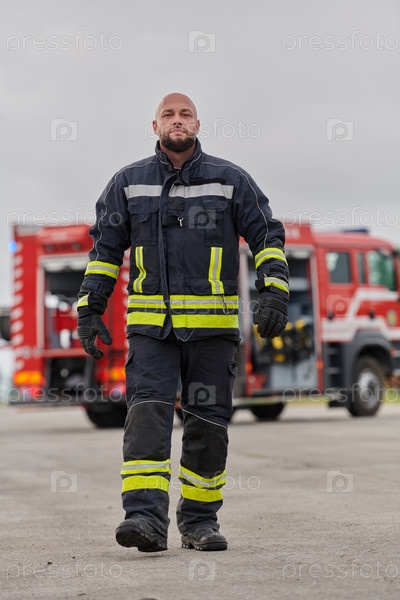 Символически храбрый пожарный шагает вперед с непоколебимым мужеством, олицетворяя самоотверженность и лидерство, в то время как позади него стоит современная пожарная машина, готовая к тушению пожара, отражающая суть героизма и готовности перед лицом чре
