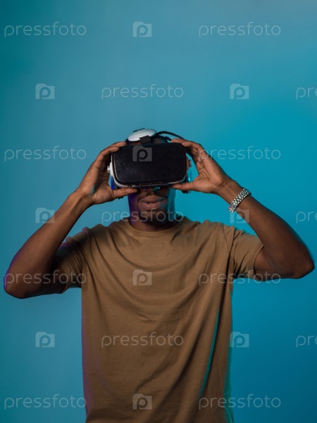 В футуристическом изображении афроамериканец стоит изолированно на ярком синем фоне, украшенный очками виртуальной реальности, которые переносят его в передовую виртуальную реальность, объединяя технологии и инновации на современном дисплее