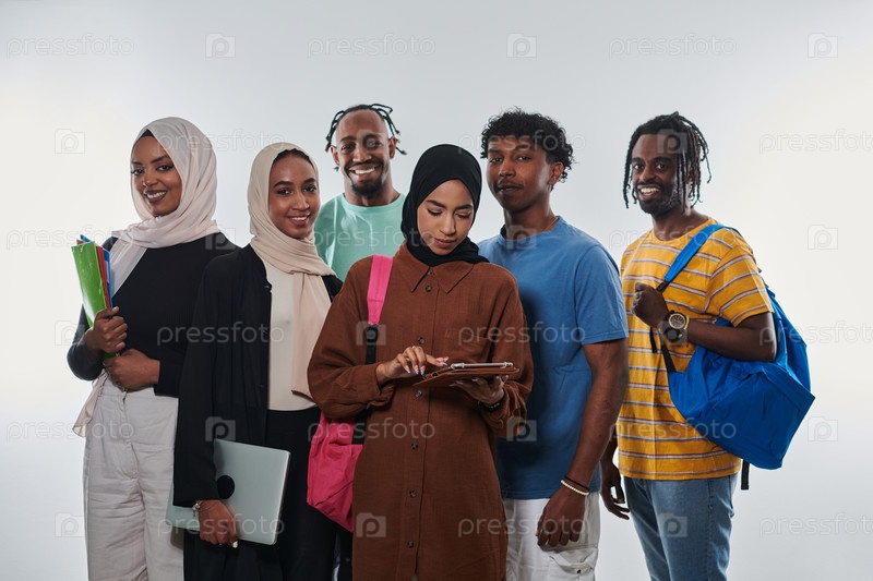 Группа разнообразных студентов занимается современными образовательными практиками, используя различные технологические инструменты, такие как ноутбуки, планшеты и смартфоны, на чистом белом фоне, иллюстрируя современный подход к совместному обучению и до