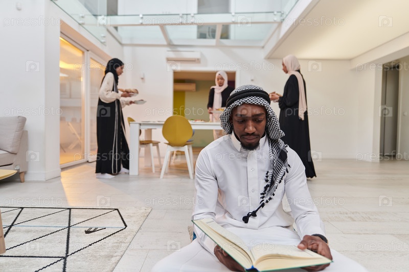 В священный месяц Рамадан афроамериканец-мусульманин, поглощенный чтением Священного Корана, окружен фоном, на котором три женщины в хиджабе готовят и подают еду для ифтара, изображая сцену духовной преданности, культурного единства и общественного праздн