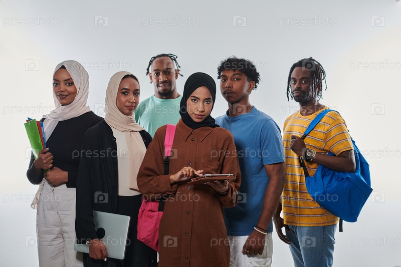 Группа разнообразных студентов занимается современными образовательными практиками, используя различные технологические инструменты, такие как ноутбуки, планшеты и смартфоны, на чистом белом фоне, иллюстрируя современный подход к совместному обучению и до