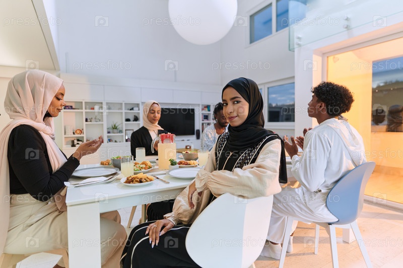 В священный месяц Рамадан разнообразная мусульманская семья объединяется в духовном единстве, горячо молясь Богу перед разговением, фиксируя момент коллективной преданности, культурного разнообразия и семейной радости посреди священного праздника