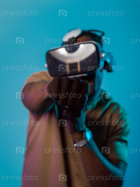 В авангардной сцене афроамериканец участвует в передовых играх виртуальной реальности, используя очки VR для погружения в футуристические боксерские игры, расположенные на ярко-синем фоне, демонстрируя плавное сочетание технологий, инноваций и взаимодейст