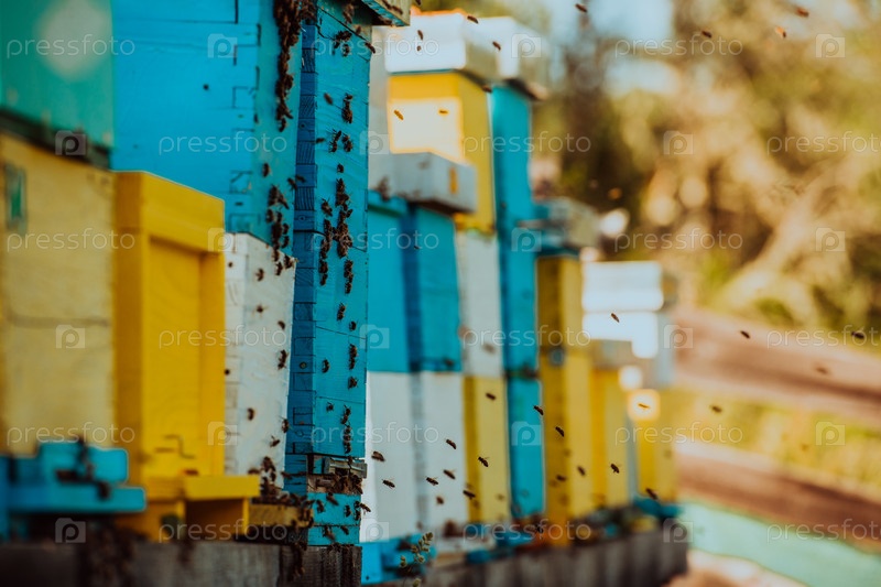 Крупным планом фотография пчел, парящих вокруг улья, несущих пыльцу