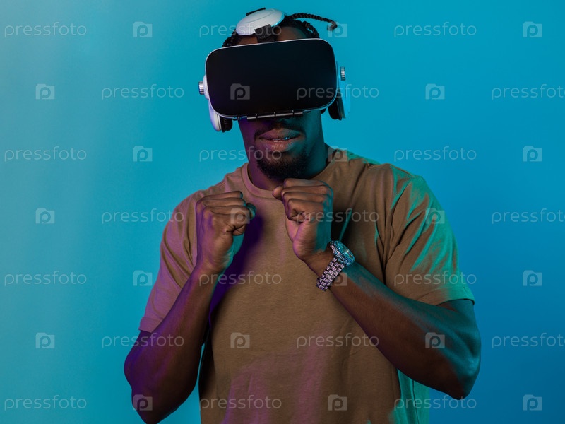 В авангардной сцене афроамериканец участвует в передовых играх виртуальной реальности, используя очки VR для погружения в футуристические боксерские игры, расположенные на ярко-синем фоне, демонстрируя плавное сочетание технологий, инноваций и взаимодейст