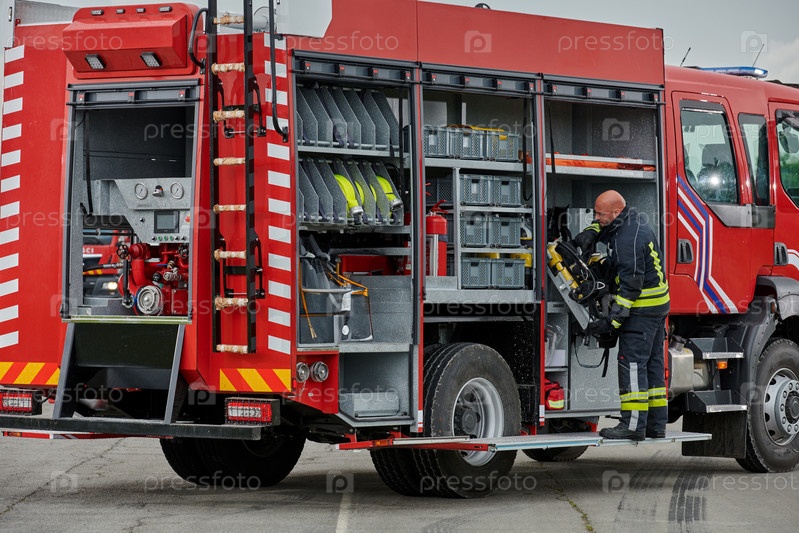 Пожарный тщательно готовит современную пожарную машину к миссии по эвакуации и реагированию на опасные ситуации, демонстрируя максимальную приверженность безопасности и готовности перед лицом чрезвычайной ситуации с пожаром