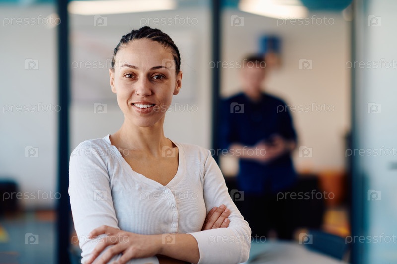 Портрет деловой женщины в творческом открытом офисе коворкинга со скрещенными руками. Успешная деловая женщина, стоящая в офисе с копировальным пространством. Партнеры работают в фоновом режиме