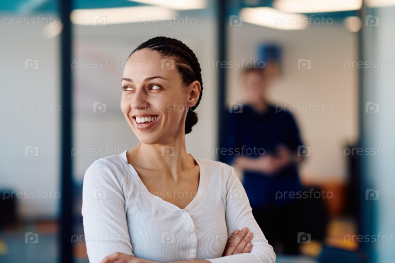 Портрет деловой женщины в творческом открытом офисе коворкинга со скрещенными руками. Успешная деловая женщина, стоящая в офисе с копировальным пространством. Партнеры работают в фоновом режиме