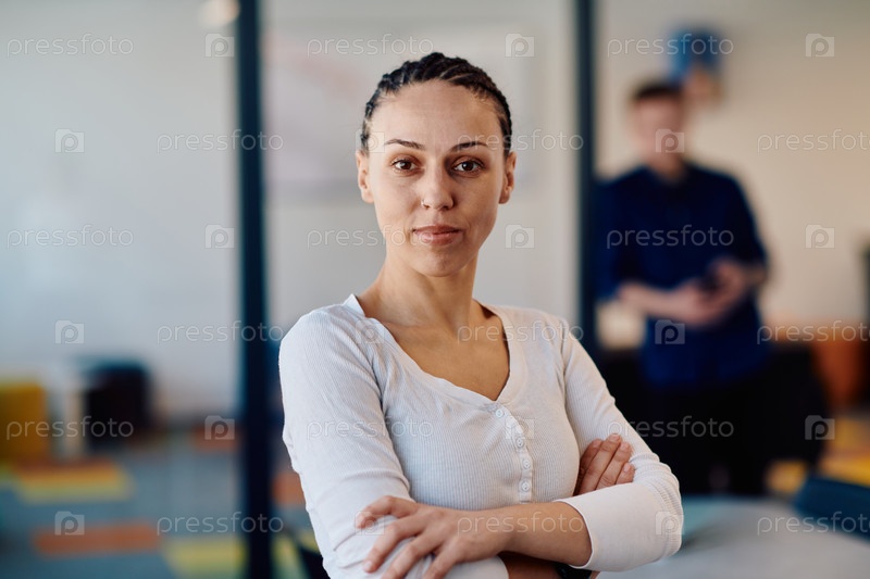 Портрет деловой женщины в творческом открытом офисе коворкинга со скрещенными руками. Успешная деловая женщина, стоящая в офисе с копировальным пространством. Партнеры работают в фоновом режиме