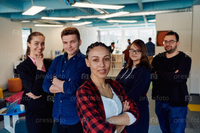 Портрет успешного творческого бизнесмена и деловой женщины, смотрящей в камеру и улыбающейся. Разнообразные деловые люди стоят вместе при запуске