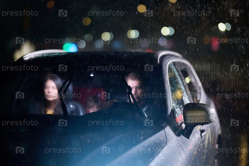 Посреди ночного путешествия счастливая семья наслаждается игровыми моментами в машине, путешествуя в дождливую погоду, освещенная светом фар, смехом и сплочением