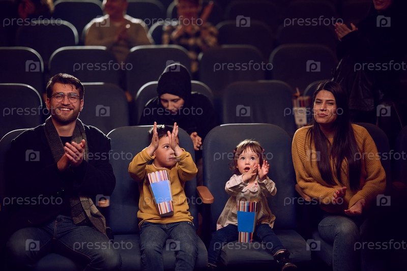 Современная семья приятно проводит время вместе в кинотеатре, наслаждаясь попкорном во время просмотра фильма со своими детьми