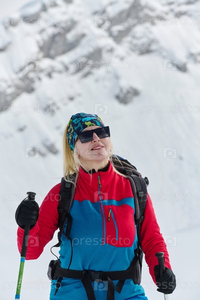 Женщина-альпинистка поднимается в Альпы со снаряжением для бэккантри